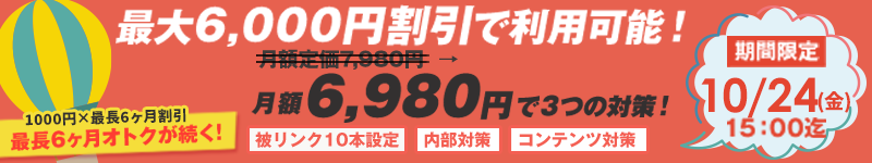 SEO Pack新規お申込みは「月額1000円割引」最長6ヶ月の割引適用をさせていただきます。