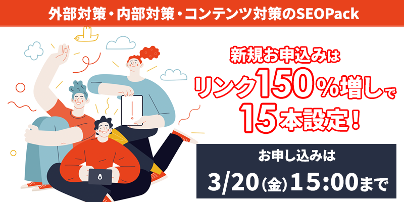 ・「新規お申込みSEO Pack(3ヶ月・6ヶ月プラン)」の外部リンクを通常10本のところ+5本増量設定、最大15本の外部リンク対策を開始できます。